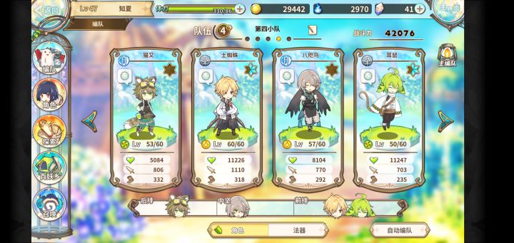 折腾了一两天,终于把阵容凑出来了。试过了,自动打没问题,甚至连法器都不要点。这个阵容主要还是靠八咫鸟抬血线,土蜘蛛主力输出,耳鼠大招负责保正土蜘蛛不会被群体攻击打死。两个星级角色最好突破到第四档,不然血量不够。回忆卡以加攻击为主,加技能效果、加收到回复效果、加血量的回忆卡看着上,并且最好全员拿到感情线回忆卡。下面讲解光属性的八咫鸟和土蜘蛛。由于这两个上次活动就养得差不多了,并且对于水属性b