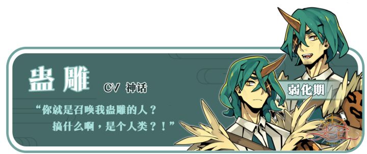 蛊雕是一种似鸟非鸟的食人怪兽,样子似豹又像雕,故名为蛊雕。水属性妖怪,有角,偶尔会发出婴儿啼哭的声音,据说是用来吸引猎物的。Cv:神话出处:《山海经·南山经》曰:“又东五百里,曰鹿吴之山,上无草木,多金石。泽更之水出焉,而南流注于滂水。水有兽焉,名曰蛊雕,其状如雕而有角,其音如婴儿之音,是食人。”蛊雕的故乡在鹿吴山,鹿吴山没有花草树木,倒是有很多金属矿物和玉石。生活在泽更水之中的蛊雕,是一种