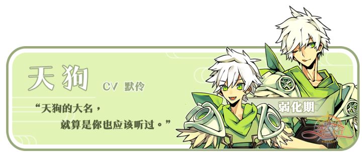 天狗是白首如狸的猫科妖怪,也是御凶辟邪、攮灾除害的瑞兽,拥有风属性,能自由地控制风。明明是猫科妖怪,却得到了“天狗”这样的名字,因此对犬科妖怪没什么好感的样子。Cv:默伶出处:《山海经》有云:“又西三百里,曰阴山。浊浴之水出焉,而南流注于蕃泽,其中多文贝。有兽焉,其状如狸而白首,名曰天狗,其音如榴榴,可以御凶。”传说中,天狗的故乡在阴山。天狗长得像狸且是白色的脑袋,叫声有点像猫。虽然叫作天