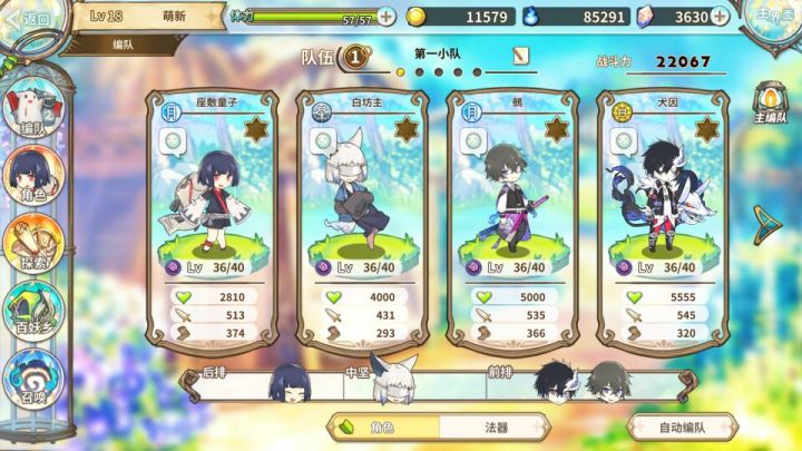 这个号是7月1号开始玩的,3号打完主线了,而且也没有卡过,不管是什么关一路打过去,大号走水队6图不升40根本不行,暗队全员36都能轻松毕业,不过现在暗队基本是犬因和鵺捆绑的,座敷也是必备的,剩下一个我用的是白坊主(对,就是很多人都说不厉害的那个,这个号上只有他但是个人体感还挺强的)回忆我后来没改,鵺是300血其他都是100攻的,反正无脑过主线(就是后面鵺都一直死就是了)其他属性的还在测试,看看能