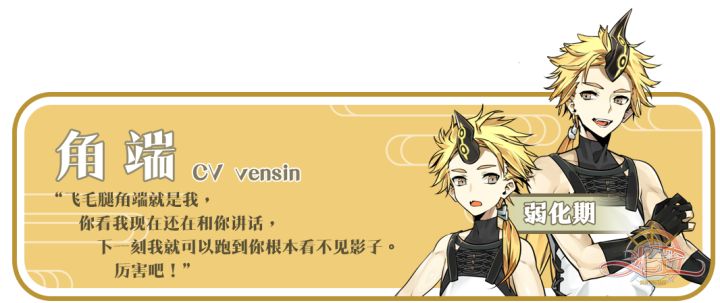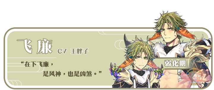 飞廉是传说中的天神,人面鸟身,又称风伯、箕伯等等。他也是风之神,能够给人间带来风。同时,飞廉又称蜚廉,是年支十四星之一,属于凶星。Cv:王胖子出处:作为天神的飞廉,其最早的出处来自于《楚辞·离骚》:“前望舒使先驱兮,後飞廉使奔属。”在不同的时期,他也有着不同的身份:商纣王时期,飞廉是朝中重臣;皇帝蚩尤时期,飞廉作为风伯,是蚩尤的左膀右臂;但其风神的身份一直是主流。而作为凶星的飞廉,则是源于中