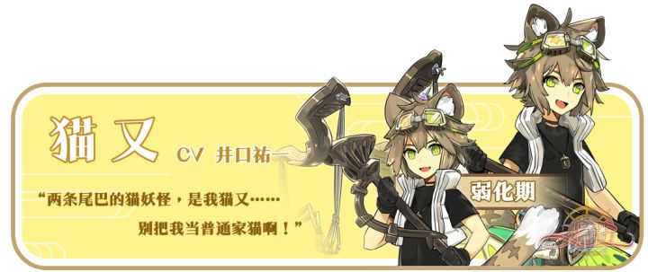 猫又是扶桑神话中的猫妖,据说有着两条尾巴,耳朵大而尖,牙齿为双面锯齿型,还能够直立行走。Cv:井口佑一出处:猫又的传说最早出现在扶桑的《灵异记》中,描述了一只猫死后产下的胎儿变成人的故事。猫妖的身体大约是人类体型的一倍多,大只的猫妖甚至跟小牛差不多大小,尾巴在末端分叉为二。善良的猫妖经常会化作少女模样以亲近人类,性格也比较温顺;而一些比较凶残的猫妖,则会攻击人类,甚至是对人类造成严重的伤害。猫