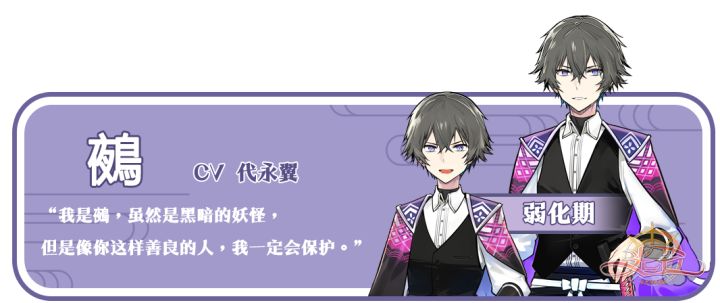 鵺是扶桑国传说中的生物,拥有猿猴的相貌、狸的身体、老虎的四肢和蛇的尾巴。鵺的叫声像虎鸫,被认为是不详的叫声。据说鵺会判断人的善恶,被它认为是“善”的人会得到鵺的保护;如若不幸被判断为“恶”,鵺会用残忍的方式对其进行惩罚。Cv:代永翼出处:关于鵺的记载,其实最早出自于华夏《山海经》。“单张山有鸟,如雉,文首,白翼,黄足,名曰白鵺,食之已嗌痛。”不过在华夏这边很少见到鵺的身影。之后,鵺的形象被化