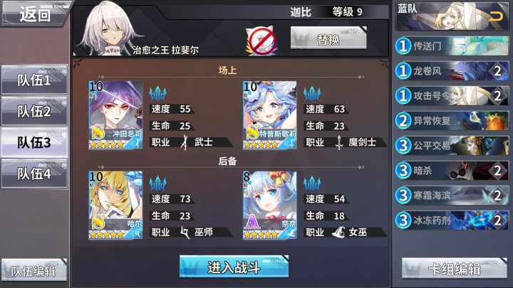 阵容一:纯绿队适用关卡:绝大部分思路:尼玛过牌,商人过牌,第二回合开始养尼玛,尼玛能保住,输出就爆表,过早死了就重开。阵容二:屠龙队适用关卡:999血的龙思路:前排挨揍,等前排死了,巴斯德上。巴斯德的再动配合援助的黑骑,快速破盾,巴斯德过牌抽到痛分和绊脚石关键卡就可以对龙使用。阵容三:兰斯洛特队适应关卡:2-8、2-9有多段低伤害的boss思路:先刷初始手牌,最好有防御号令或者王者