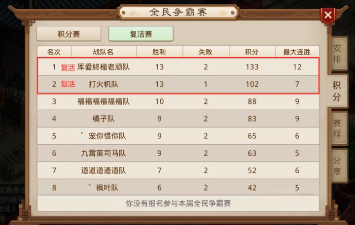 经过一晚上激烈的角逐,2024年全民争霸的复活赛已经尘埃落定,从120支队伍中脱颖而出的2支队伍是:厍爱終極老顽队、打火机队。这2支队伍成功复活,与晋级的8支队伍举行10进4的排位赛,最终积分前4的4支队伍将参加线下总决赛终极对决。让我们回顾一下近期全民争霸赛的赛况吧~今晚21:00全民争霸赛10进4淘汰赛第一场,快来看看有哪些值得期待的看点!#问道手游