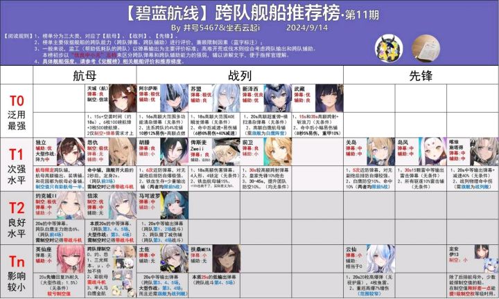本家上接 -----------------------------------------3. 萌新舰船推荐【注】舰船推荐仅代表个人理解,有不同意见欢迎在评论区讨论1、首先,不要盲目对着强度/节奏榜练船,很多角色在你舰队没成型前是不建议优先练的(比如体系队伍);2、前期等级压制是很重要的,即使你练的不是所谓的推荐舰娘也能轻松过主线;3、未出现在推荐里的角色,一般来说,彩>金>紫>蓝
