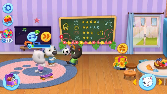 《汤姆猫总动员》中无论是动画背景,还是角色画风都特别精美,鲜艳多彩的颜色搭配以及丰富多样的玩法吸引了大批的粉丝。游戏中的玩法很多样,与很多游戏不同的是,《汤姆猫总动员》不仅仅是养一只宠物,我们需要同时照顾六只小可爱,另外,游戏中也隐藏了很多玩法和彩蛋,需要我们自己去发现,可谓惊喜满满。那么我们游戏中的小黑板,同样是惊喜所在。其实我们每当帮助宠物完成各自的心愿的时候,我们黑板上的星星都会发生改变。