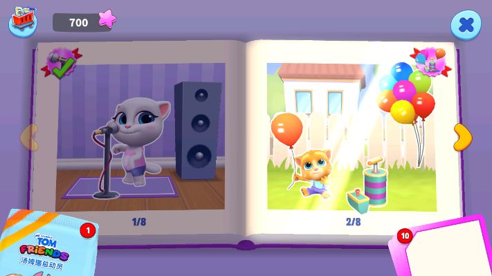 《汤姆猫总动员》是一款休闲益智的养成类游戏,游戏中要照顾不同的宠物,依据各自的需求去和它们互动,饿了要给它喂食,病了要给它吃药等,尽量满足它们不同的需求。游戏中可以互动的物品有非常多,我们也可以将物品摆放在屋子内,那么一些没有解锁的新物品是怎么获得的呢? 其实没解锁的物品是通过图册进行解锁的,我们将获取的卡牌放置在图册里面,当某一页集齐所有元素构成一幅完整的照片后,我们就可以获得奖励啦。图册每一