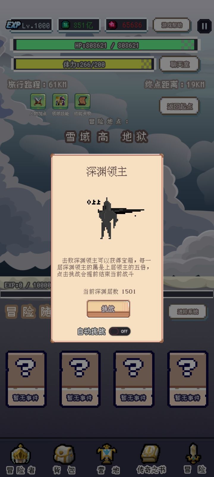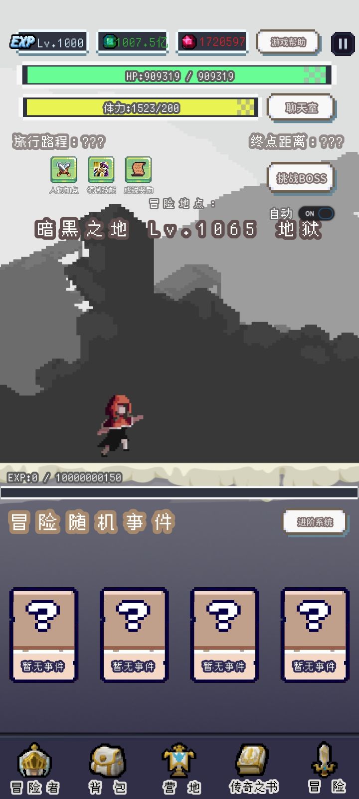 当前版本深渊极限应该是1501层了,暗黑之地推到1065了技能全触发都打不死BOSS秒伤已经上万亿了,都打不死BOSS,血太厚了
