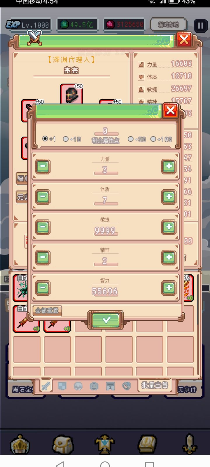游戏大致情况萌新可以看看少走弯路 (勇者黑袍都一样)初始进游戏有20属性点,可以加在幸运(勇士黑袍都一样),幸运能高速触发事件 现在版本不推荐加锻造了 游戏模式难度在左下角选择进入游戏不要开启高速刷怪模式,等历练(升级主要方式)升级期:每一百级做一次装备前期紫色绿色装备都够用,装备磁条洗速度(双速更完美) 加点也是敏 到300级以上可以做橙装 神级晶石留着700级以后用 到700级可以做红武