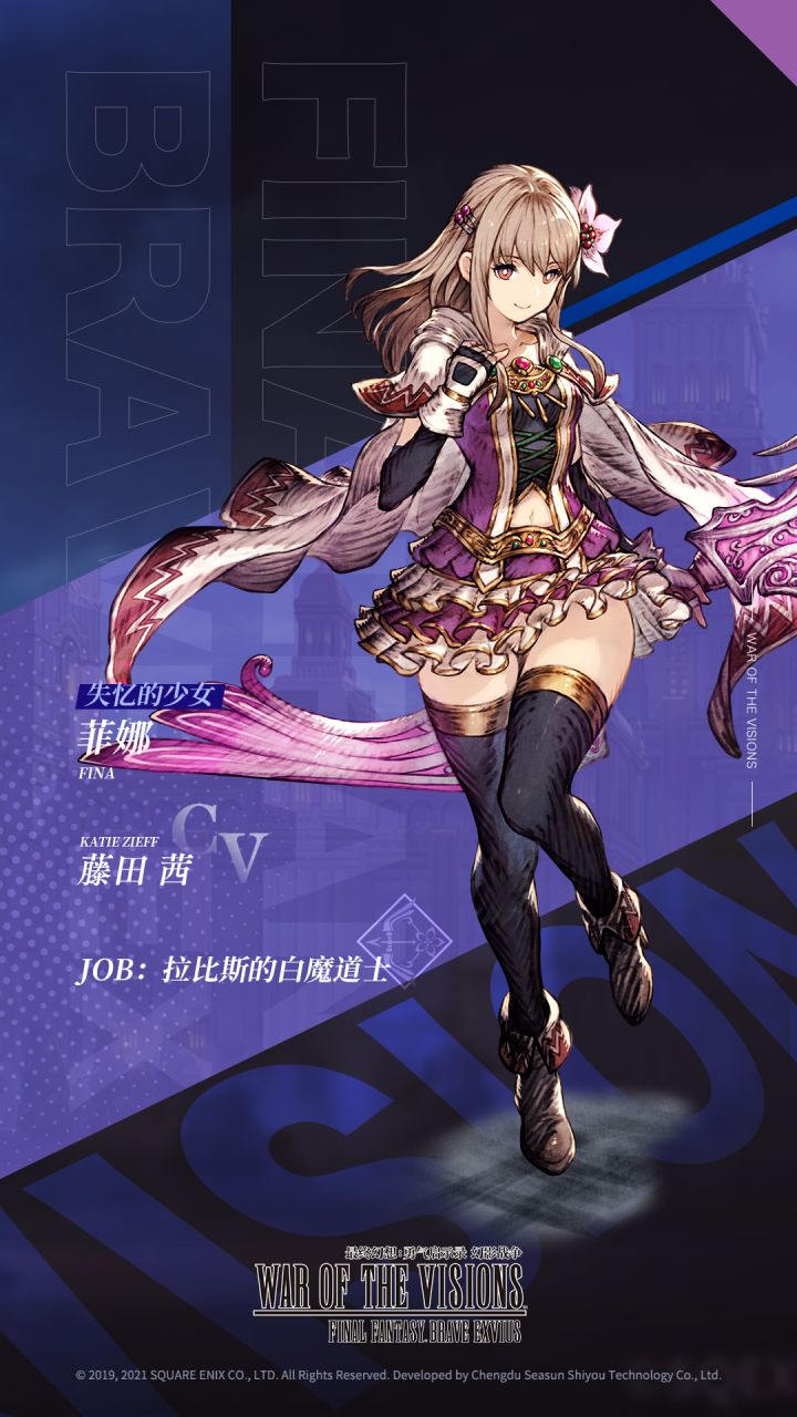 「失忆的少女」菲娜所属:FFBECV:藤田茜据说是从水晶中出现的少女。她只记得自己的名字,除此之外没有任何记忆,言行如同一无所知的纯真无邪的孩子一般。很擅长用弓和白魔法,但本人似乎也不明白自己为什么会用这些。技能介绍:-------------------------------------------【联系我们】官方网站:微信公众号:FFBE幻影战争微博:@FFBE幻影战争【