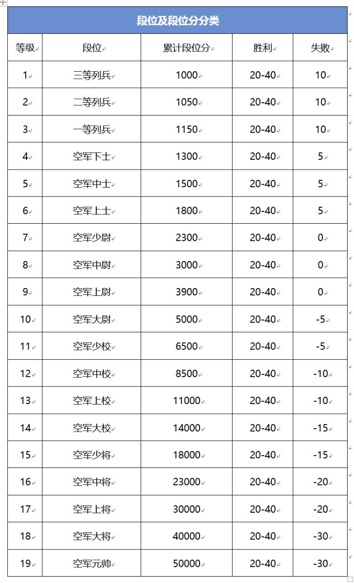 Hello~大家好,这里是歼108号机驾驶员,也是你们的情报员,我又来啦~所谓“不想当元帅的士兵不是好士兵”,作为一个三等列兵,我们的目标远远不!止!于!此!然而万丈高楼平地起,如何从“三等列兵”晋升到“空军元帅”呢?跟我一起去看看吧~一、段位等级1.段位与段位分累计段位分:达到各个段位所需积累的段位分。胜利、失败:不同段位飞行员,每次完成对局时获得的段位分。段位升级:每位飞行员进入游
