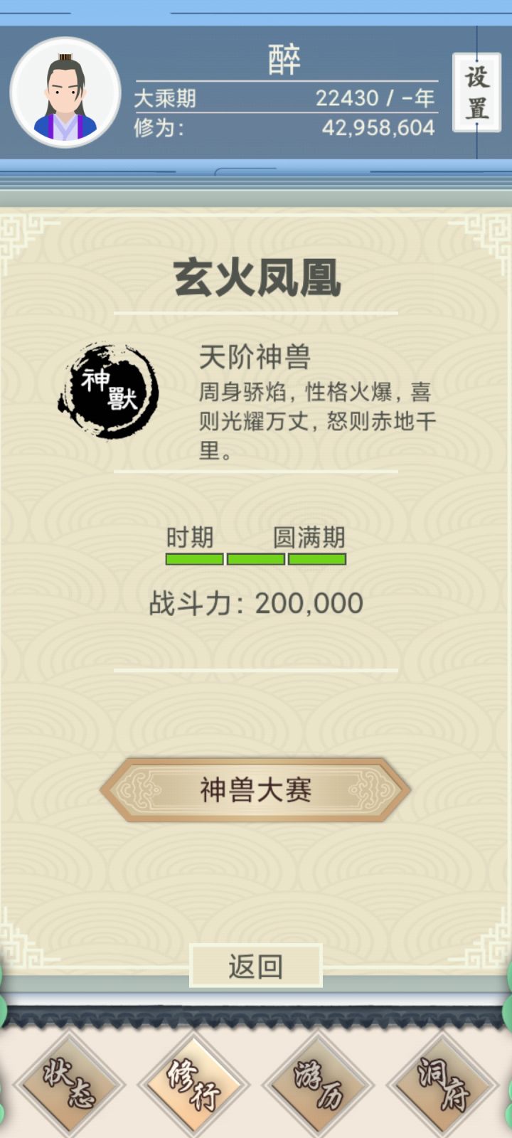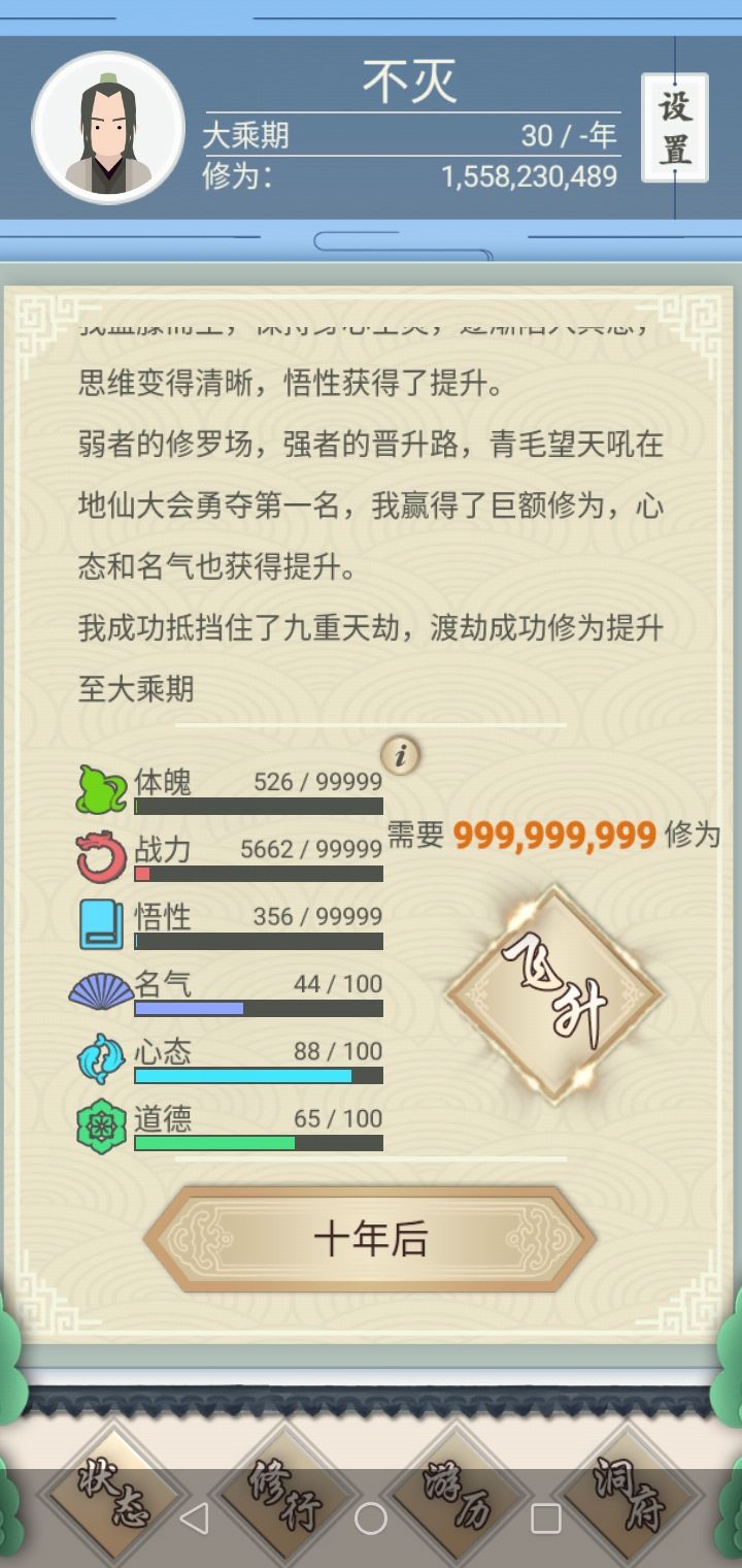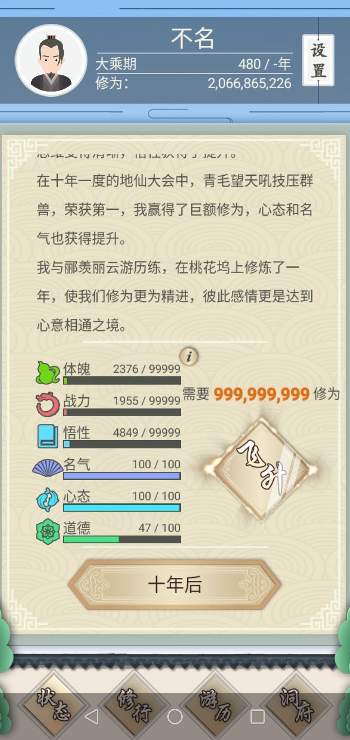 【自定规则】禁新的人生;(想重玩就卸载游戏重新下载)禁娶妻生子;禁看广告作弊(再战/避损/刷新)禁开任何礼包。保证攻略的严谨完美。【游戏目的】①1200岁前晋升分神、2400岁前出窍、3600岁之前合体;②分神购买金翅万里鹏;(合体之前不买任何其他神兽)③培养最强神兽。【要点分析】①、不娶妻生子避免繁琐操作;②、不拿判官笔(觉得祸害村民不妥);③、全程只买2头神兽:金翅大