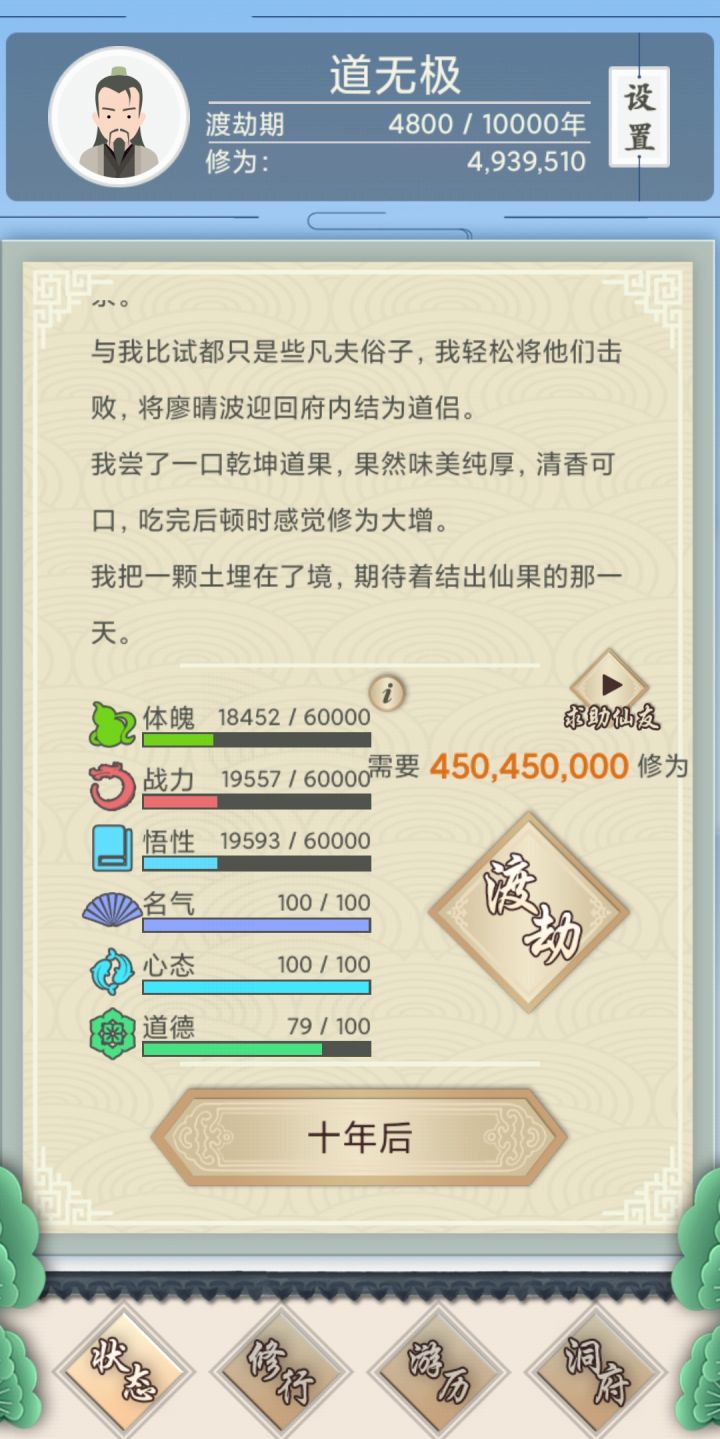 10岁:开100修为礼包QZDF27QW、买道君经、韵灵丹。开始选择题尽量+道德。因为很多事件我们必须做坏人才能利益最大化,为了保持较高道德,有必要开局多一些道德。道德高事件发生几率更高、事件结果更有利。后面无关痛痒的一点点损失都忍了保持道德。失火不要救、母子求救不要救、邪修的药要抢来吃(-体魄也忍了,+修为更重要)。多玩几次就会明白这些事件要怎么选择。总之80%的事件你都选择最邪恶