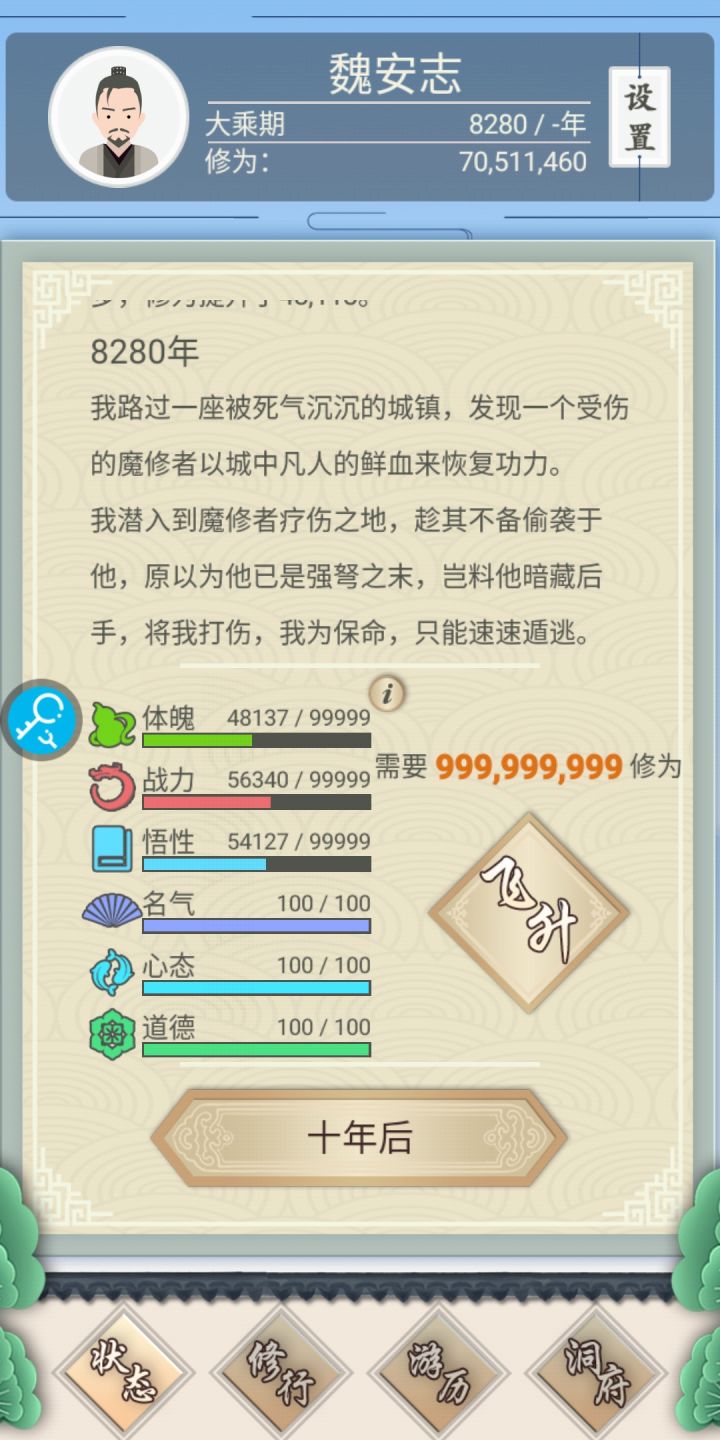 3天到了渡劫期给玩家梳理下,再给作者点建议。1.升了境界先丹后经,优先拉满。吐槽:无脑最贵拉满实在是无聊,求求作者了,最贵的第二三四个能不能对应某项更高,第一个价格巨高效果略有提升即可。 这样好歹有点指望不是一键过。2.前期所有事全拉满,然后逐渐考虑放弃补分没收益的,比如去游历会消耗体魄,神兽会白给,合体以上实在没必要为了那点东西掉体魄收益跟不上了。卖冰一直卖冰,4-5k买7-8k卖,这样很