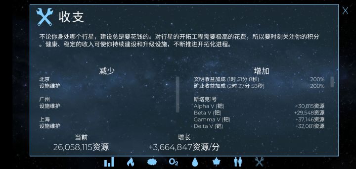通关了10来个星球,被水淹了无数次,用3级科技建筑调气候数据调的手麻,总结了一套省心的发展攻略。前期不建城市,一直挖矿发育,科技发展 :儿童中心-交通网络-太空港-气压里的储能设施-生物实验室。然后就一直扩张城市用的最原始的居住单元,4个太空港配一个生物实验室 免得后期气压太高。等经济上来了开始调节宜居性,几个一级科技建筑配合二级科技建筑调节气。太阳镜基本用不到,水位失控的时候直接一个最低温