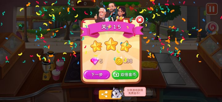 已经全部三星挑战成功了,包括两个特殊关卡也是,花了几天的时间!!!要不是因为体力太少,有时候看广告都累了!建议恢复体力时间快一点。半个小时一个体力,我出错两秒就没了。还有我基本不用道具,都靠手速,还挺不错的,有些餐厅我都不用全升级完都能过。