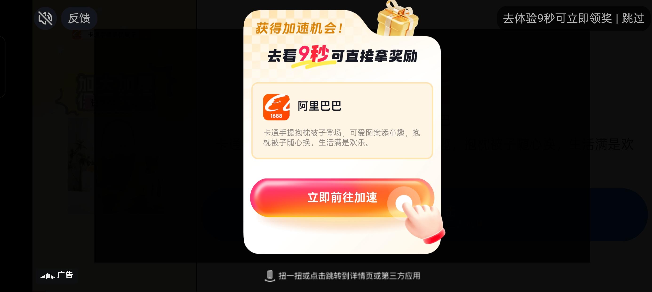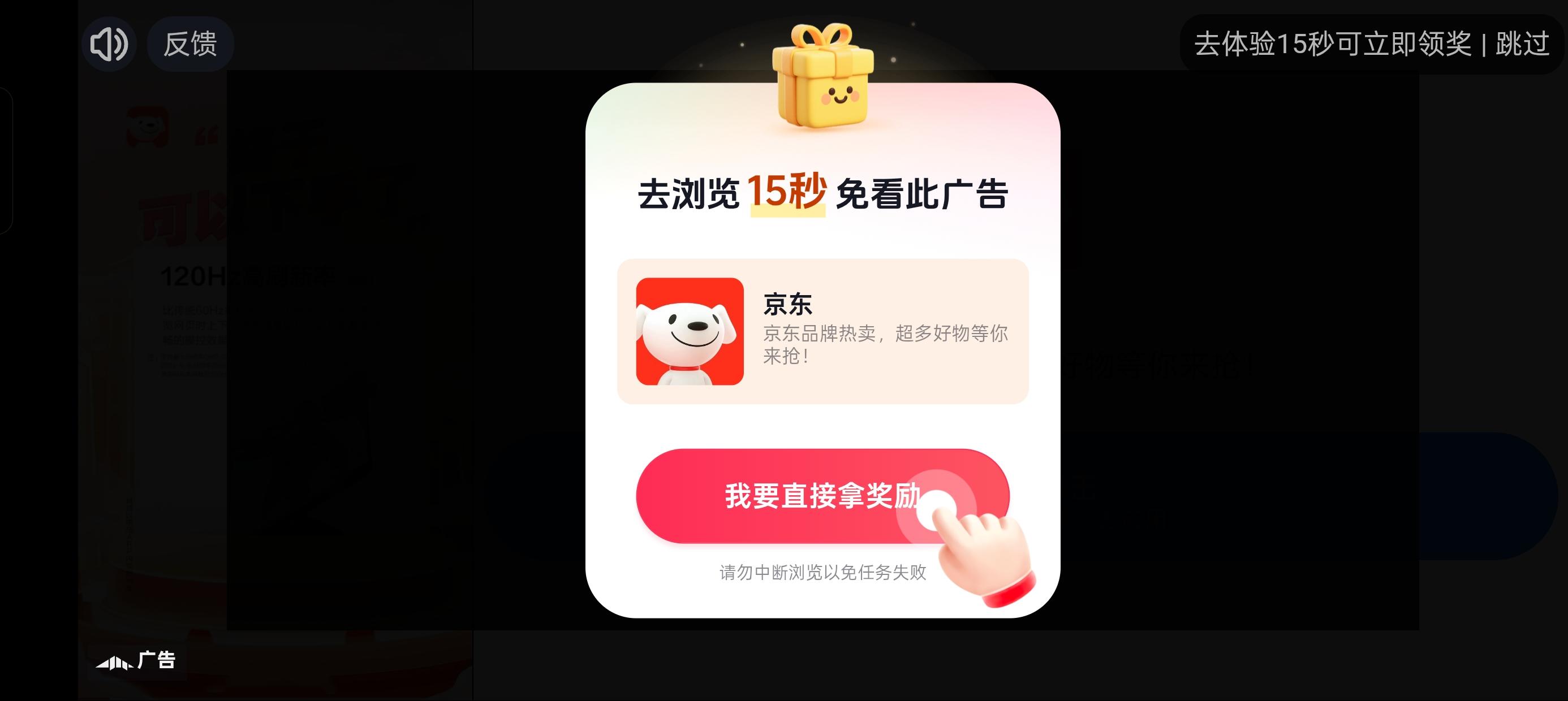 看10s可以拿奖励,但加速奖励是跳转浏览15s,并且不可以拒绝加速奖励。后面几个是同样状况的,这个页面长得都一样应该是同个广告商,没有“拒绝加速”这个选项我请问呢。日常任务要看五个这种广告,孩子听了一直吐。