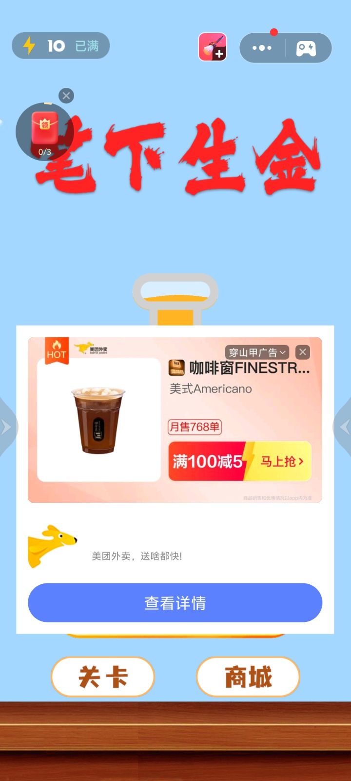 Rt,本来看广告刷金币呢,全是小游戏广告也没什么,但点完回来好歹给我一个❌的地方啊。被迫大退重进然后发现重进的不算双倍,来回几次我真的会裂开