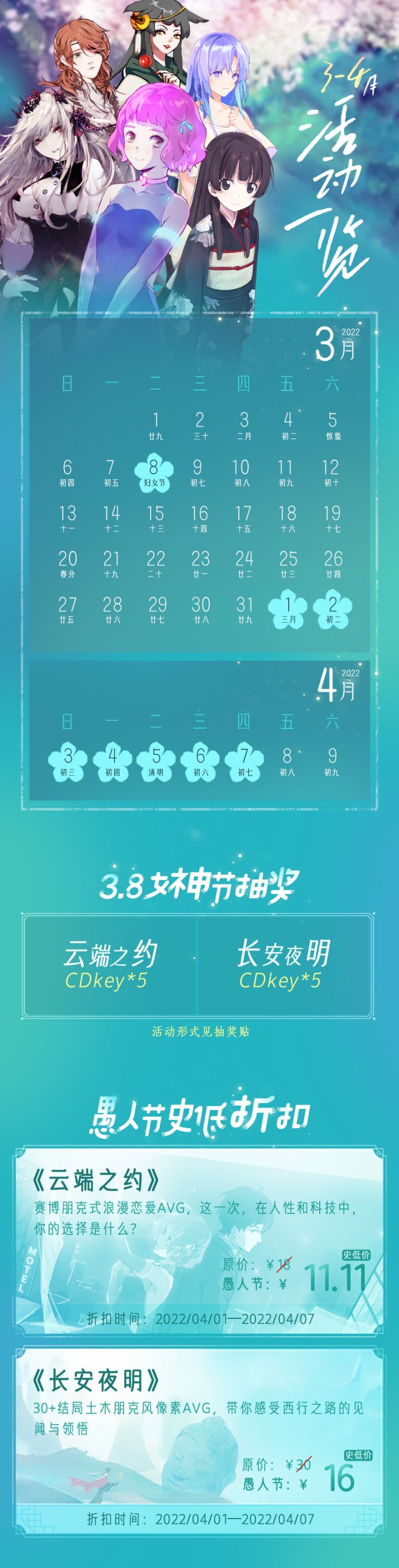 大家好~时隔8个月,我们的新故事明天就要和大家见面啦,这是旅人计划的首款自研手游,还望大家多多支持,点个预约·~此外,《云端之约》和《长安夜明》也将开启新一轮史低折扣~还没有入手的小伙伴们不要错过哦~新游戏上线,将会有更好的故事,更好看的人物,以及更丰富的人物等待着大家!明天十点,敬请期待!