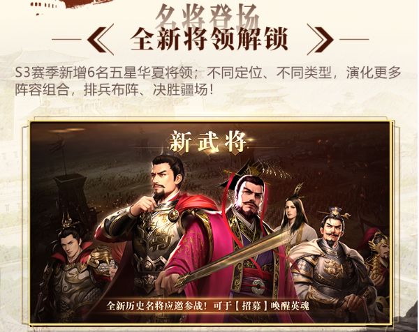 征霸之世再轮回,S2征战天下,安邦定国S3战乱四起,群雄林立经过月余的赛季历程我们终于迎来了S3赛季S3除了新将领与新技能的加入本赛季特别更新了两个特色兵种将为君主们提供更多的搭配空间带来更激烈、刺激的战斗体验下面先随喵酱一睹为快吧~【新增转区功能】自S3赛季开始所有大区都将加入“转区”功能当君主完成S2赛季之后便可以通过“转区”功能自主选择想去的S3大区不再由官方进行