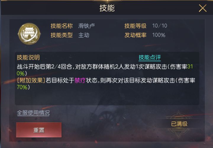 在征霸中每局对战最多可打满8个回合,而大多数将领在每回合只有1次释放技能与普攻的机会,所以将领释放技能越稳定、造成的伤害越高,就能获得更多对战优势。1、 回合体系优势无论是主动技能还是追击技能都属于概率释放技能,除了极少数技能拥有100%发动率,大多数技能的发动率都在40%~60%之间。基本所有队伍中,一旦输出链中某个技能未成功发动,后续的所有技能的发挥都会受到影响,所以某些经过特殊搭配后的阵