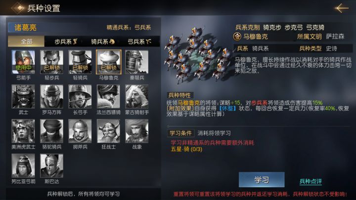 S3赛季中加入了两个全新的兵种,相比其他兵种而言,这两个兵种虽然属性增幅较低,但都具备独特的机制,能极大的改善部分将领的生存环境和输出效率,本期便盘点一下新兵种的用法!【马穆鲁克】①兵种效果马穆鲁克是骑兵系兵种,尤其擅长持续战斗,配置该兵种的将领可获得谋略+15的属性增益,并且给予开场效果【休整】,每回合都可以恢复一定兵力。该兵种的属性增益类型和治疗计算类型,基本定性了使用马穆鲁克的使用将领