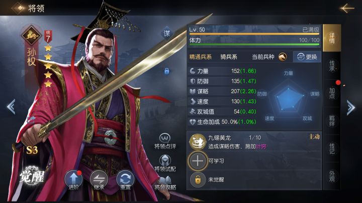 谋略将领虽然普遍有着极高的爆发能力,但他们本身坦度较低,普攻也无法补充多少伤害,唯一的输出方式便是利用技能发动。但大多数技能发动率较低,一旦发动失败基本宣告对局结束,所以绝大多数的谋略阵容,都非常惧怕计穷控制。本期为大家介绍的这名将领,就拥有目前征霸中计穷施加最高效率!【将领解析】孙权是九州阵营在S3赛季新加入的一名7统核心,但他与其他阵容输出的核心不一样,这是一名优化阵容控制,克制谋略系队伍