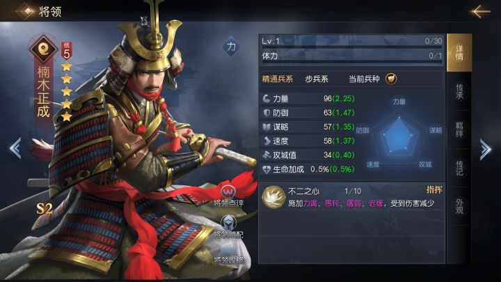 对征霸中的将领而言,属性的高低比技能本身更重要,优秀的技能需要优秀的属性才能发挥,而同等兵力和技能的情况下,属性差距带来的影响会非常明显。本期为大家推荐一个能持续削减敌方属性的将领。【将领解析】楠木正成的定位并不是通俗意义的输出或辅助,他主要依靠技能发挥一些特殊的效果,更符合功能性将领的定位。由于不二之心需在行动后触发,虽然可全程叠加,但为了提升每回合的实际效果,建议全加速度,即使是1.37的