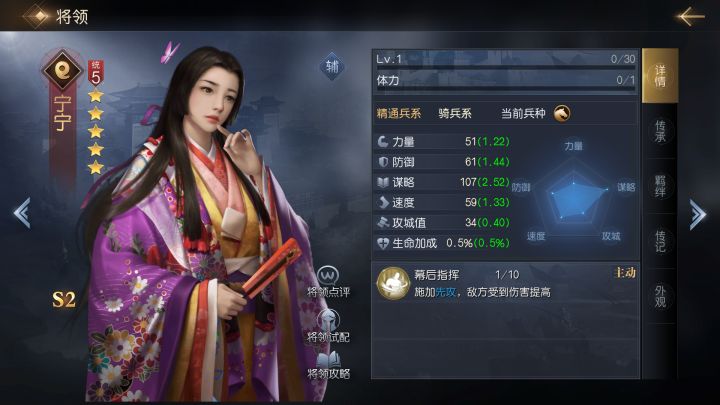 先攻状态是保证队伍拿下开局优势的最佳效果,几乎所有菜刀、法刀队伍均是建立在此技能上,之前征霸中仅有美尼斯、达芬奇这两名可施加先攻的将领,直到S2中宁宁的加入,给予了先攻队更多的选择,本期就来看一下这名将领的用法吧~【将领解析】宁宁拥有不错的谋略成长与速度成长,她在发动技能后能为主将提供先攻状态,并让其在每次使用主动技能时,都为敌方施加一个增伤debuff。5统御的设定会比另外两名将领更快使用到