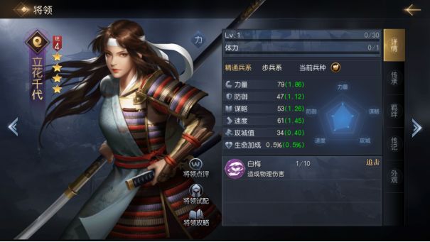 征霸中五星将领最为强力,但获取具备一定门槛,在前期可以用一些优质的武将作为过渡,完成开荒,本次为大家分析的将领为立花千代,将从基本属性、技能特点、技能搭配以及阵容搭配等方面进行全面解析,希望对小伙伴们有所帮助!一、 【将领解析】立花千代是游戏中东瀛阵营的一名四星级物理输出型将领,统御值为4,精通兵种为步兵系,立花千代力量属性成长达到1.86,属于四星普遍水平,但其攻速成长达到1.45,在同级别