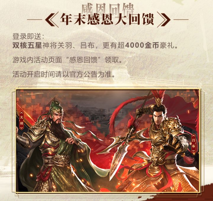 亲爱的君主大人们,好鸭!告诉大家一个好消息!《征服与霸业》全新S5赛季“针锋相对”,将于11月25日正式开启!新赛季将会开启全新的福利活动-感恩回馈、全新的竞技玩法-竞技场、全新的休闲玩法-休闲势力、全新的五星将领、全新的特色兵种、全新的典藏技能、以及QQ微信玩家同服竞技!是不是有点小期待呢~下面就让我们来看一下具体内容吧~年末感恩大大回馈为了感谢长期以来一直支持《征服与霸业》的新老君主大人