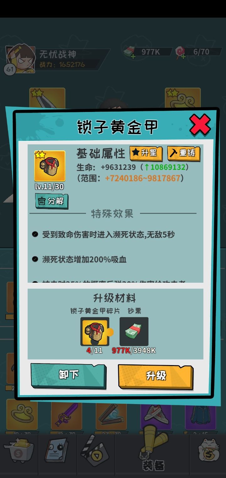 bug1.有时候无敌失效,例如我穿了锁子黄金甲后触发无敌确还是被搞死2.装备升级加成,有的装备属性数值的下一级数字写的是提升部分战力,有些是写的下一级的战力,如图