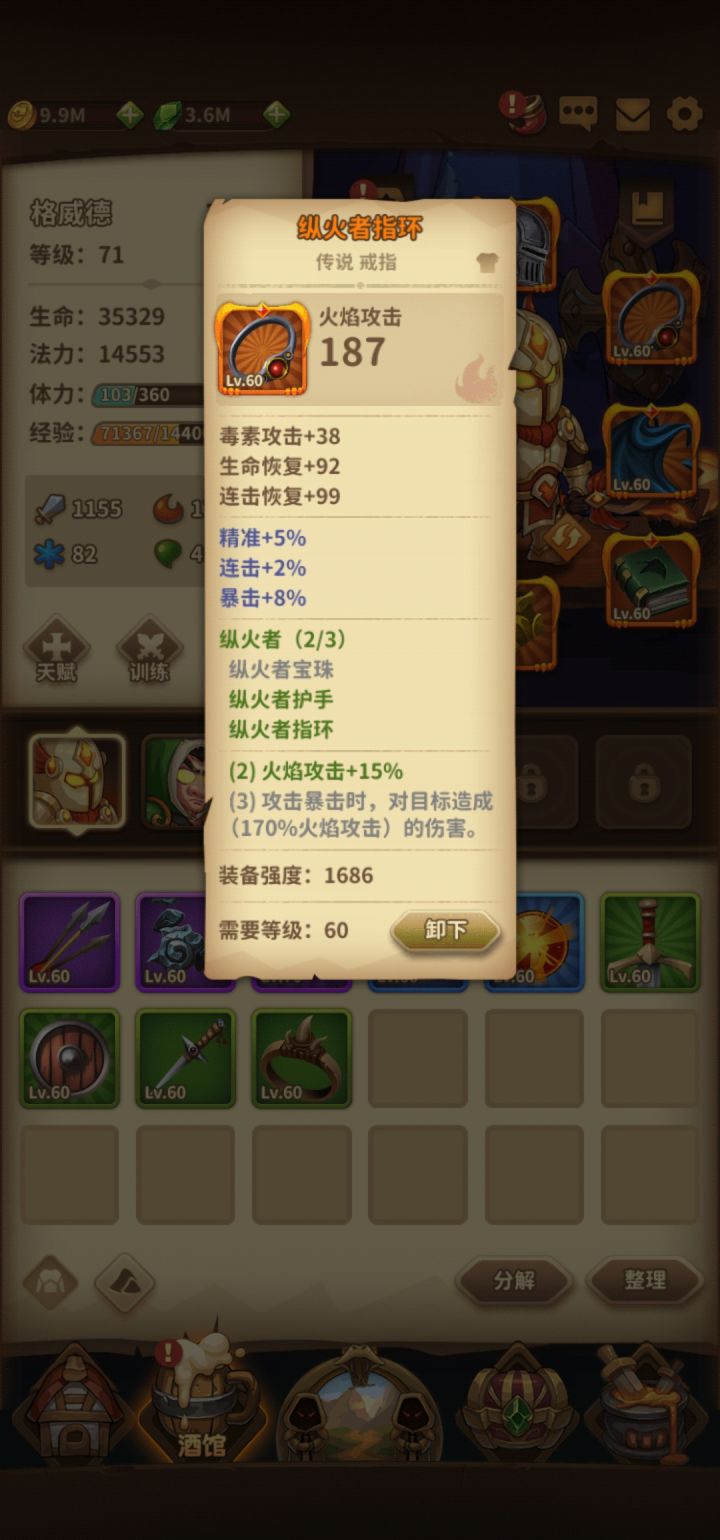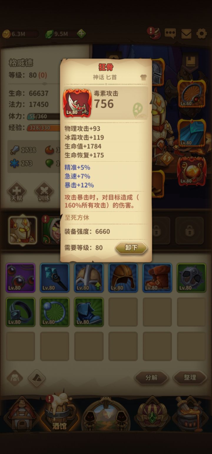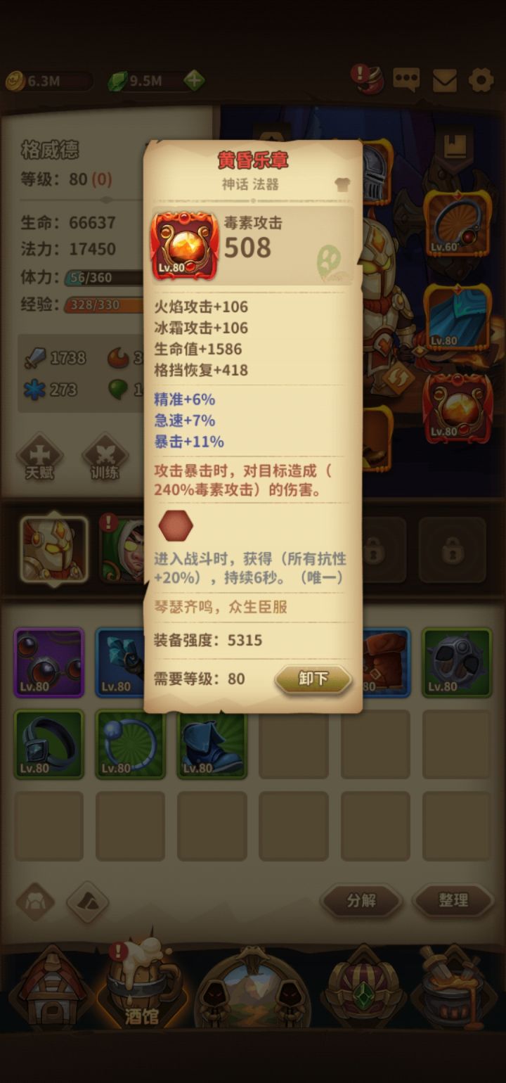 作者:....作为一个已经玩了15天的佛系玩家,现在塔1133层图地狱10。因为游戏时间少、资源不多,我只有一套装备,5个角色共用。话不多说先放装备:武器:狂骨、副手:魔龙之心、衣服:极速鞋:振奋、手:挑畔者、戒指:赤瞳、项链:海洋之心、头:复仇这些装备属性随机,看你主玩那个角色吧。我主玩审判,物攻火攻都行,没太高要求。专精选择:都选开天、二次打击、白热手套符文选择:前面暴击后边加什么