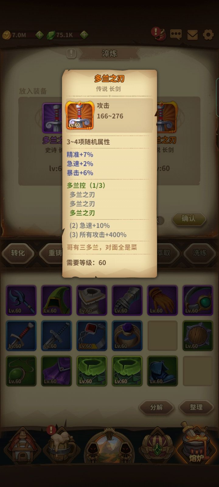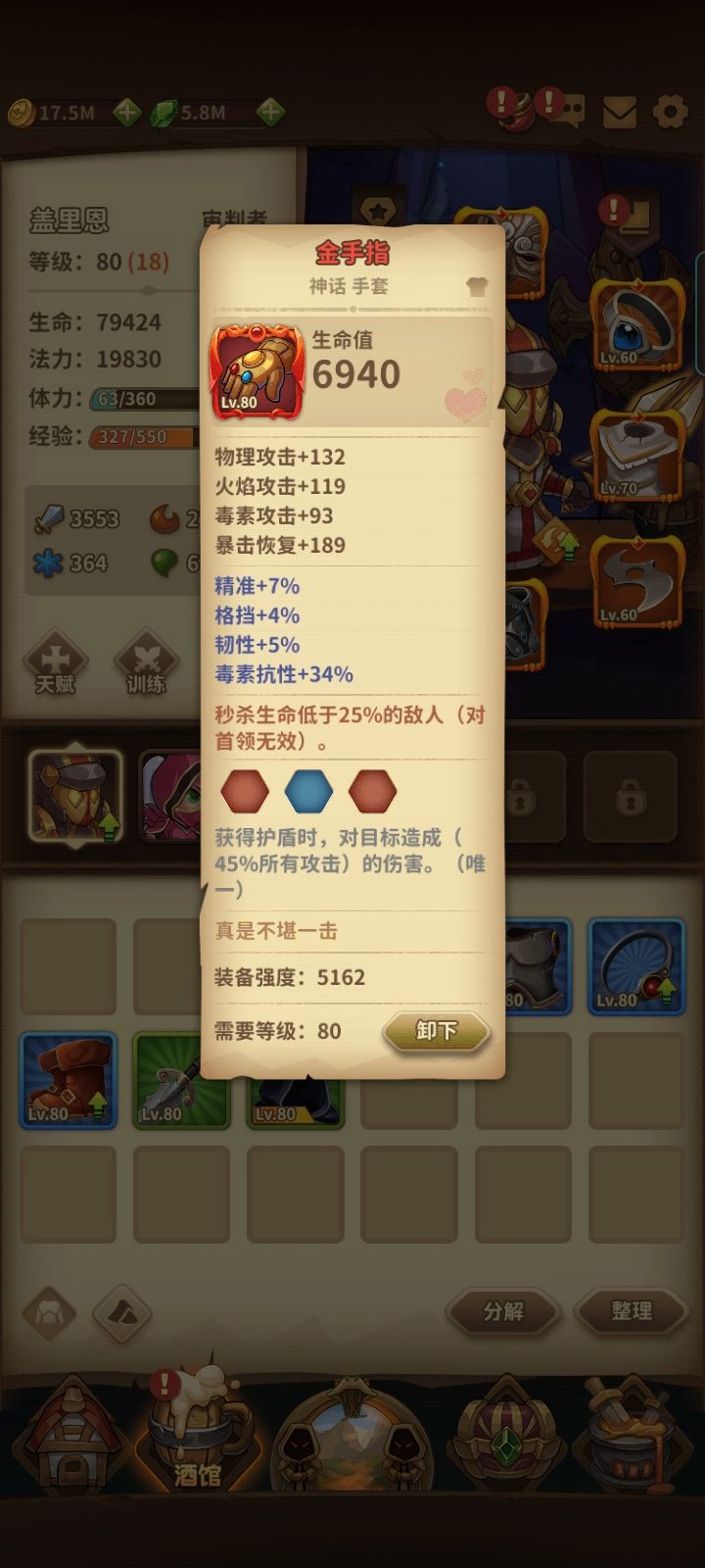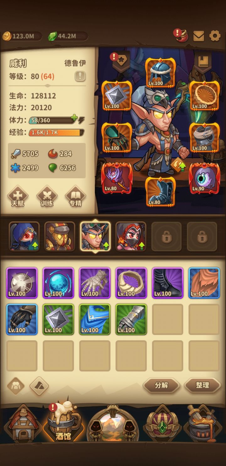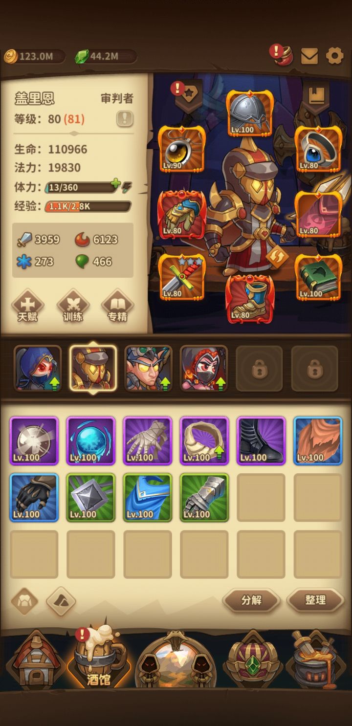 玩了快两个星期了吧,前期走了点弯路,主力是审判+德鲁伊,其实第一个英雄是暗猎,但是发现很坑很垮。现在爬塔到760层,到900层是开110级的装备。德鲁伊是卫士套+狂野之心的戒指项链。审判是判决套加使徒,加公正套专精激活。有时候爬塔发现蓝不够!。。。。。。。。搞的有点迷茫了,现在100级的判决套出了两件,使徒是80级的,还要不要再整100级的使徒?搞的有点累了,过渡还是继续砸装备呢?