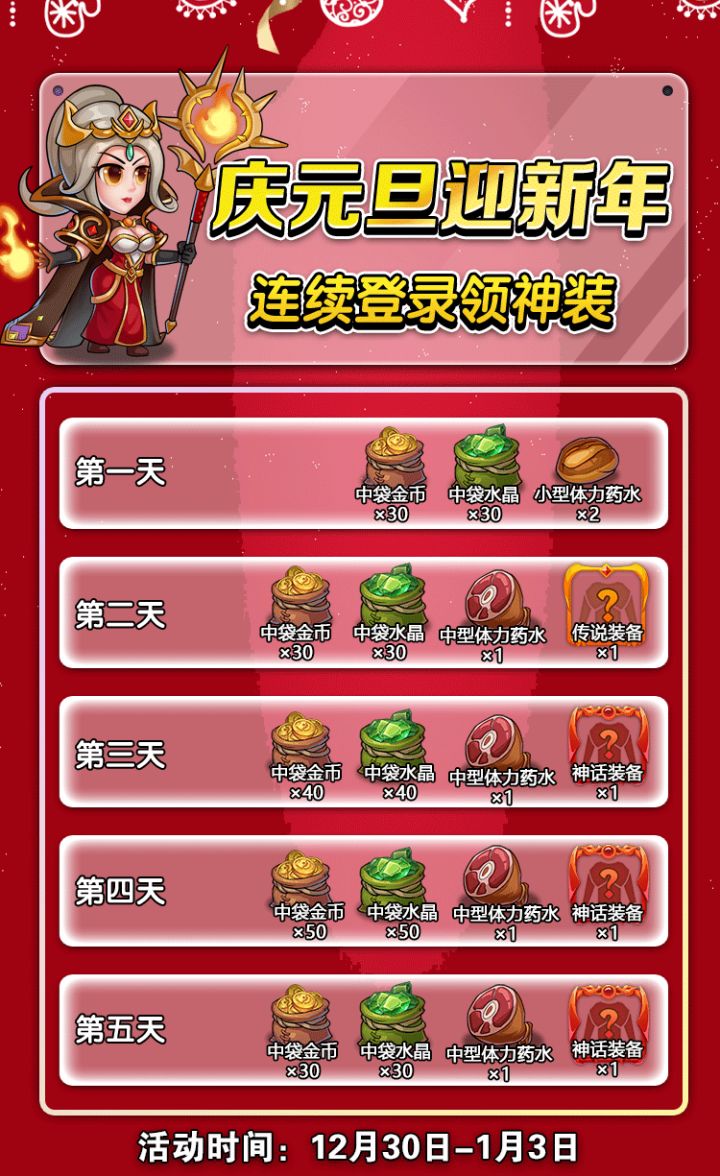 时光匆匆又流走一年,感谢过往一年各位勇士对《宝箱与勇士》的鞭策、喜爱与支持。新年来临之际,我们自然也准备了新年好礼,陪大家一起快乐跨年!【活动时间】2022年12月30日—2023年1月3日【领取方式】当日登录游戏即可领取(邮件内领取)【礼包内容】注:礼包通过邮件发放,当日有效(8:00—23:55),如当日未登录则无法领取。