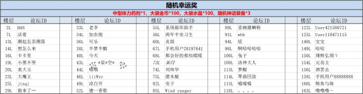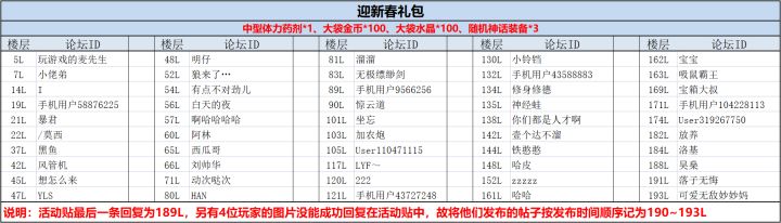 感谢各位勇士积极参与我们的“写褔迎春”活动,看过百家百褔,相信新的一年大家都会福气盈门、万事皆顺!然后就看下本次活动的抽奖结果吧~~请以上获奖玩家和参与回复的玩家在1月18日下午18:00前,联系客服:3393549793(在线时间:工作日9:30—18:30),提供游戏uid、带有回复楼层数的截图和论坛主页截图。奖励会在1月18日下午18:30前通过邮件发放。(逾期未与客服联系的玩家视为自动