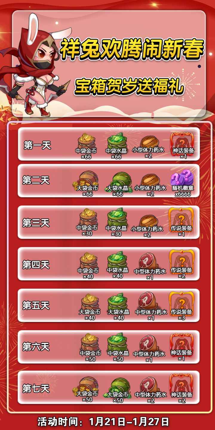 褔兔迎春到,宝箱好礼至!又是一年新春佳节,我们自然也为各位勇士准备了贺岁福利,每日登录游戏即可领取当日礼包。新的一年,祝愿大家前“兔”似锦!【活动时间】2023年1月21日—1月27日【领取方式】当日登录游戏即可领取(邮件内领取)【礼包内容】注:礼包通过邮件发放,当日有效(8:00—23:55),如当日未登录则无法领取。