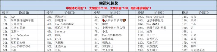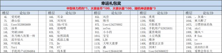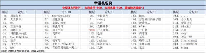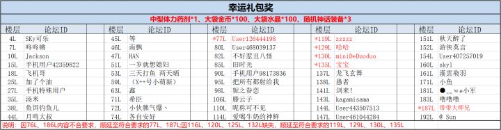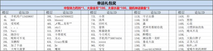 感谢各位勇士积极参与我们本期的互动活动!现在来看下本次活动的获奖玩家吧~~恭喜以上玩家获得我们本次小活动的幸运礼包:中型体力药剂*1、大袋金币*100、大袋水晶*100、随机神话装备*3请以上玩家在7月6日18:00前,联系客服QQ:2851702376(在线时间:工作日9:30—18:30),提供游戏uid、回复内容和带有回复楼层数的截图。奖励会在7月7日通过邮件发放。(逾期未与客服联系的