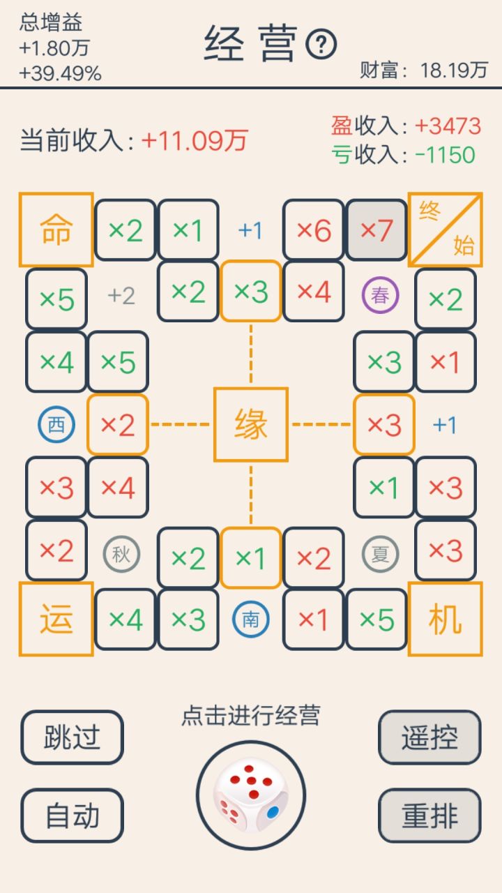 有个小bug,使用重排后盈利加倍数的位置不会更新。比如有个北方盈+1,然后北1本来是盈,重拍后变成亏了,他仍然享有+1。而相反,如果本来是亏,重排后变成盈了,不会享有+1。如图北方位有个123467,而北是盈+1的,不应该是123567吗?可见,重排并不能改变buff加的位置。不论是走过还是没走过的时候重排。(好像上次更新出员工系统的时候就有这个问题,当时没太在意,而且那会儿没怎么手动经营。)