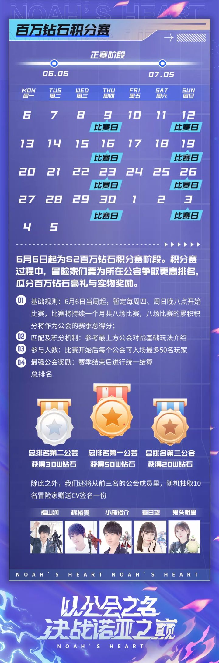 冒险家们好,《诺亚之心》百万钻石积分赛正赛阶段即将过半,相信现在各位冒险家们都已经熟悉了公会争霸玩法的规则,今天,阿泽为大家准备了《诺亚之心》公会争霸的重要小帖士,不要错过哦。公会争霸规则介绍与活动时间正赛的活动时间是6月6日至7月5日内,每周四、周六20:00开始,一共包含八场公会争霸。公会争霸没有等级限制,解锁公会系统后任何等级的冒险家都可以参加,点击公会活动页面上【公会争霸】按钮进入,前