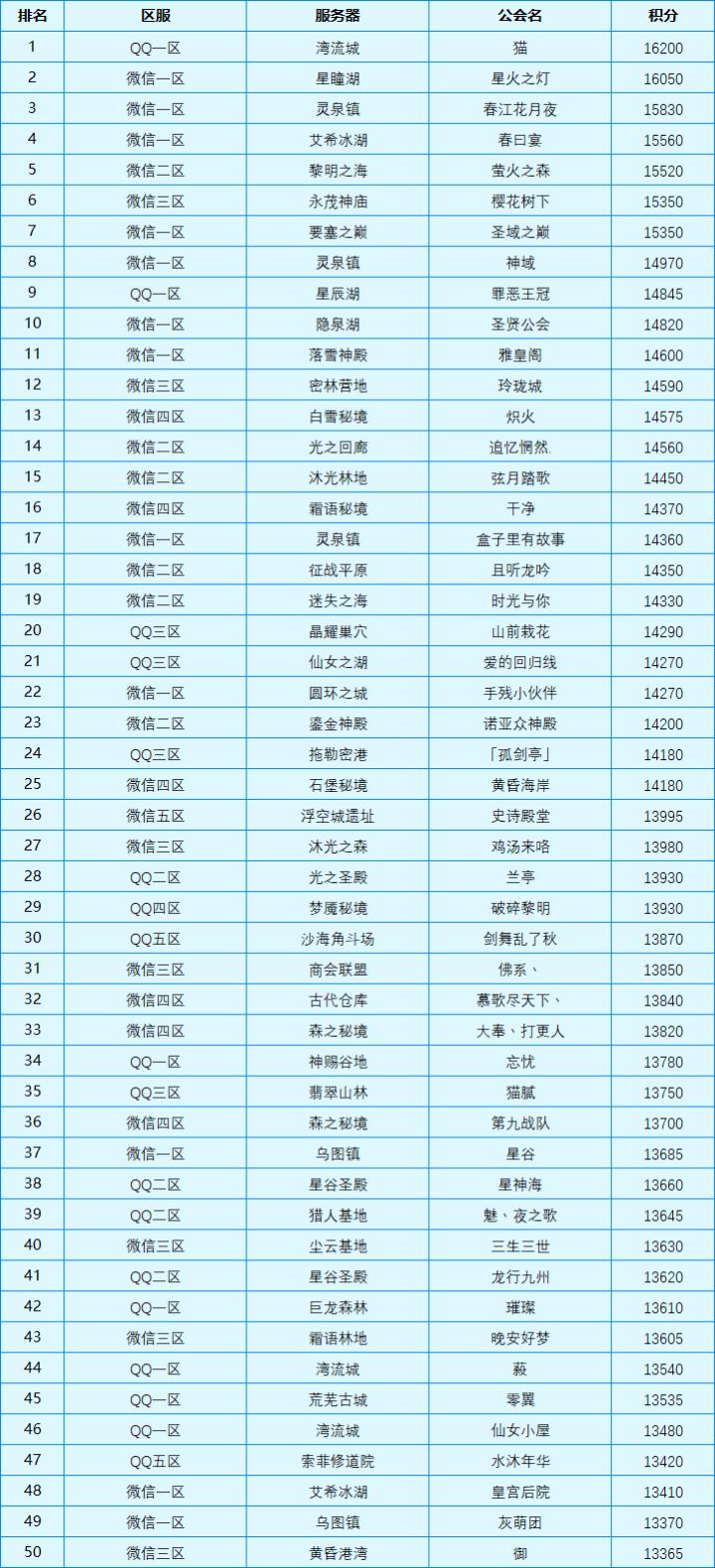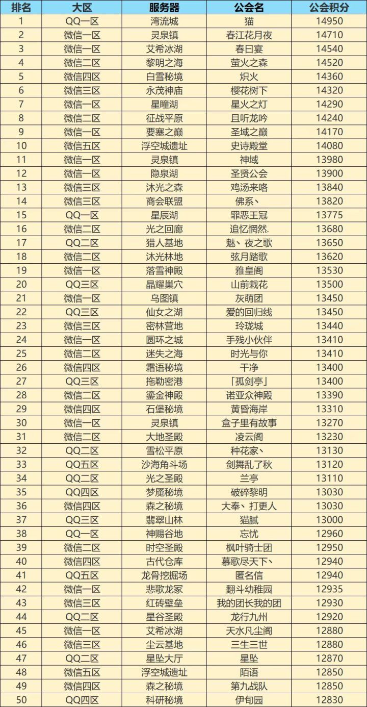 冒险家们好!经过昨天激烈的角逐,公会战排行榜又发生了变化,来跟阿泽一起看看公会积分排行榜最新排名(数据截止至6月23日)积分排名前50公会名单排名奖励将由该公会的所有人员平均瓜分,希望大家踊跃参与~剩下的比赛,冒险家们继续加油呀,为了公会荣耀而战!