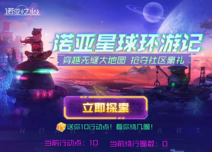 诺亚星球大环游,社区豪礼全到手!诺亚星球无缝大地图环游开始啦~本次活动形式相信冒险家们并不陌生,那就是大富翁——使用行动点摇骰子获得前进步数,探索游历诺亚星球地图。环球期间的小彩蛋会带给大家环球之旅增加助力哦~而则在环球之后的社区活动中,还有大惊喜:神秘实物大礼正在等待天选之子获取!玩大富翁小游戏,参与活动拿奖励,快来努力成为真正的大富翁吧!一、附赠行动点,助你环游星球!送你10个行动点