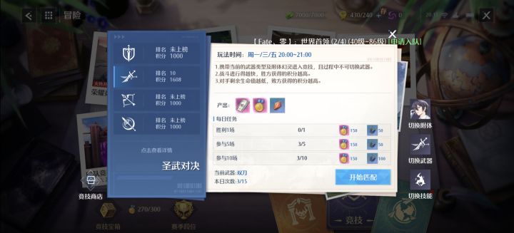 在《诺亚之心》中战斗,我们可以使用多种不同的武器。而且,由于我们在游戏中可附身战斗的幻灵数量繁多,且不同幻灵在某些特定武器的作用下会有不一样的效果,因此,武器的使用对于游戏来说也至关重要。在圣武对决玩法中,我们需要在有限的挑战次数下,尽可能用某一把武器,或者某些武器打出尽量高的排名,以获得更好的奖励。下面针对该项活动,我们就来进行一下技巧的讲解。一、活动注意事项1、开放时间:每周一、三、五,2
