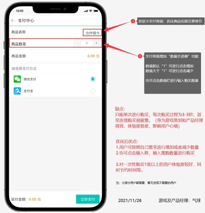 合作银卡支付界面优化建议如下图一:旧版支付界面图二:新版支付界面图三:新版说明介绍更多的有助于公司及玩家体验的慢慢提日期:2021/11/26游戏策划及产品经理:气球
