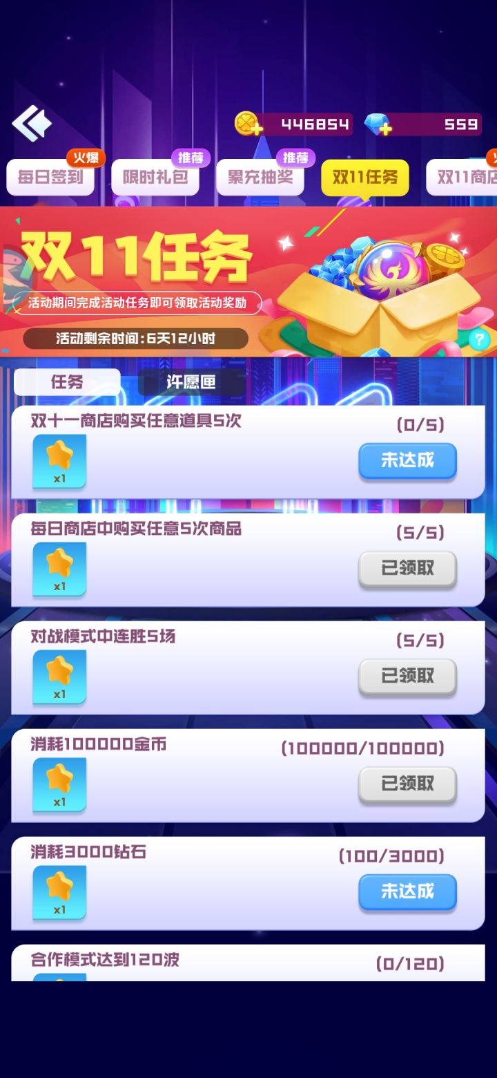 双十一任务一共15个,正好得15个许愿星,想法很好,本来也是个很有新意的活动,其中一个任务是双十一商店购买五次,再去商店一看,好家伙,星空点1800,金球1500,全是钻石才能买,那么每日商店的488是不香吗?然后这个任务完不成,许愿池也没法得到最后的奖励,那么这个双十一的一系列活动,意义到底是什么!我真是看不懂游戏策划是怎么想的,能把这样的价位设置出来,真的有想把这个游戏做好吗?说实话,球球