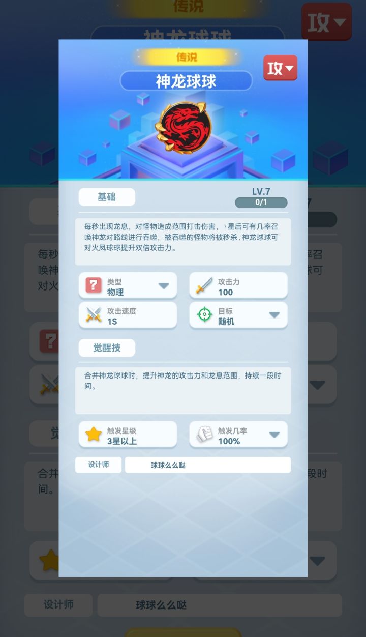 基础:每秒出现龙息,对怪物造成范围打击伤害,7星后可有几率召唤出神龙对路线进行吞噬伤害,被吞噬的怪物将被秒杀,神龙球球可对火凤球球提升双倍攻击力。