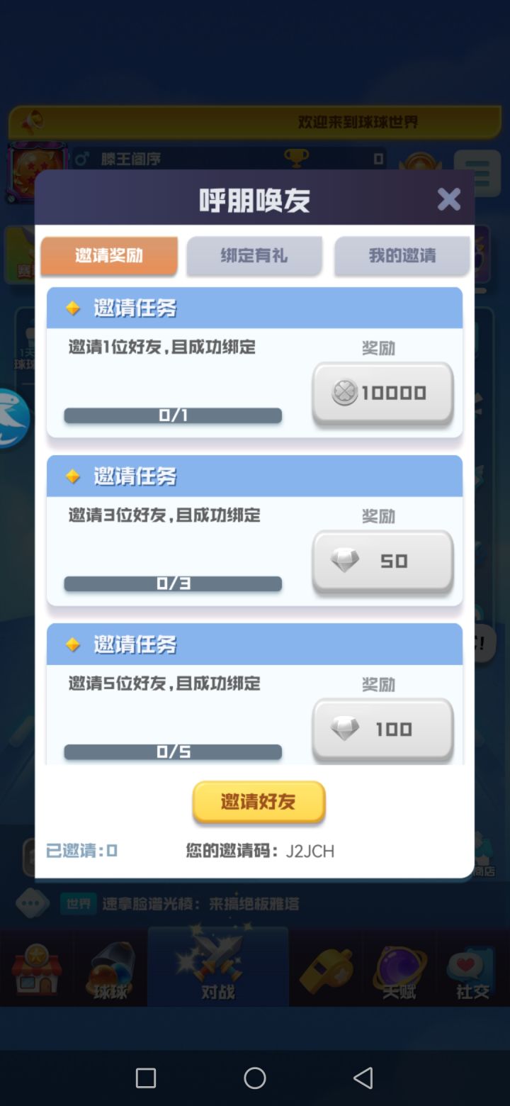好友邀请任务填写 J2JCH 可以领取邀请礼包,有机会获得传说球球。