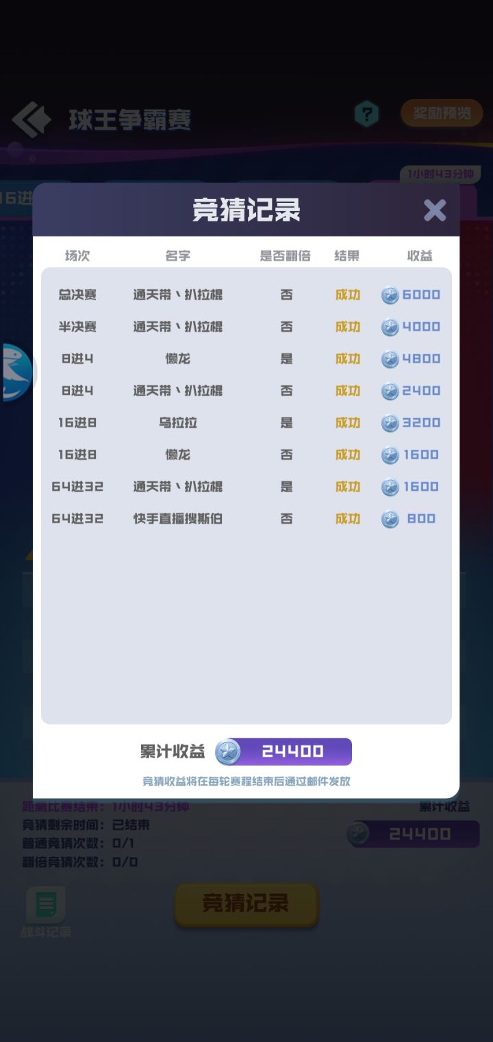 球宝们好~本次创意口号中奖名单已公布,恭喜以下得奖球宝们~奖励为随机传说球*1活动奖励将在6.29-7.5陆续发放完毕,请得奖球宝们及时留意领取~球王争霸赛即将在6月28日随版本更新后开启~球王争霸赛共分为选拔赛、突围赛、64进16强、16进4强、总决赛五个阶段悄悄说一句,决赛当晚会有官方直播哦~值得注意的是,本次球王争霸赛总奖金池超过10万元!不仅有定制奖杯、高额现金奖、球球周边