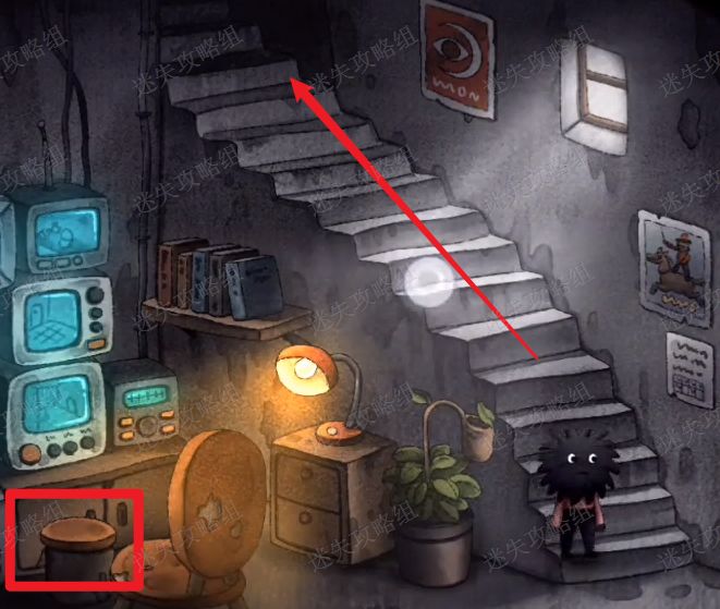 本攻略由迷失攻略组——蓬松的头发原创制作,转载请注明出处。攻略里如有任何不清楚的欢迎在底下评论,看到了会立即回复的。1. 点击下箭头,进入到下图,点击上箭头,左箭头,进入通道,往前走,拿到铁丝,然后一直往右走2. 走出管道后,下楼梯,左边黄框处拿到油漆,往下走,左边红框处抽屉拿到钥匙,右边黄框处抽屉拿到磁铁 3. 地上的机器人用硬币打开,拿到电池, 👐👐🚥🚥✘这里先不要把电池放收音机里,因为